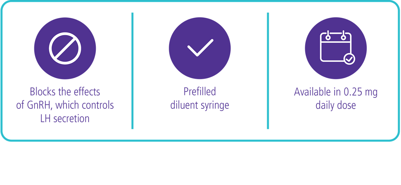 Cetrotide® (cetrorelix acetate for injection) is indicated for the inhibition of premature LH surges in women undergoing controlled ovarian stimulation. Cetrotide® should only be prescribed by physicians who are experienced with infertility problems and their management.